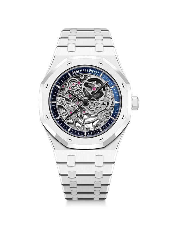 تتميز هذه الساعة الحصرية من Audemars Piguet لمنطقة الشرق الأوسط بهيكل وسوار مصنوعين بالكامل من السيراميك الأبيض، وفيها يتباين الطوق الداخلي المصنوع من الأفينتورين الأزرق – وهو ابتكار آخر من ابتكارات أوديمار بيغه.