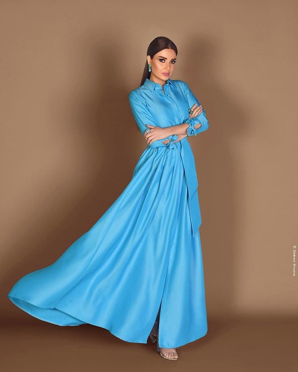 أطلت سيرين في إحدى الحلقات بفستان أزرق طويل، تميّز بقصته الفضفاضة مع حزام عند الخصر. نسقته مع صندال بالكعب العالي في إطلالة بغاية من الشياكة.