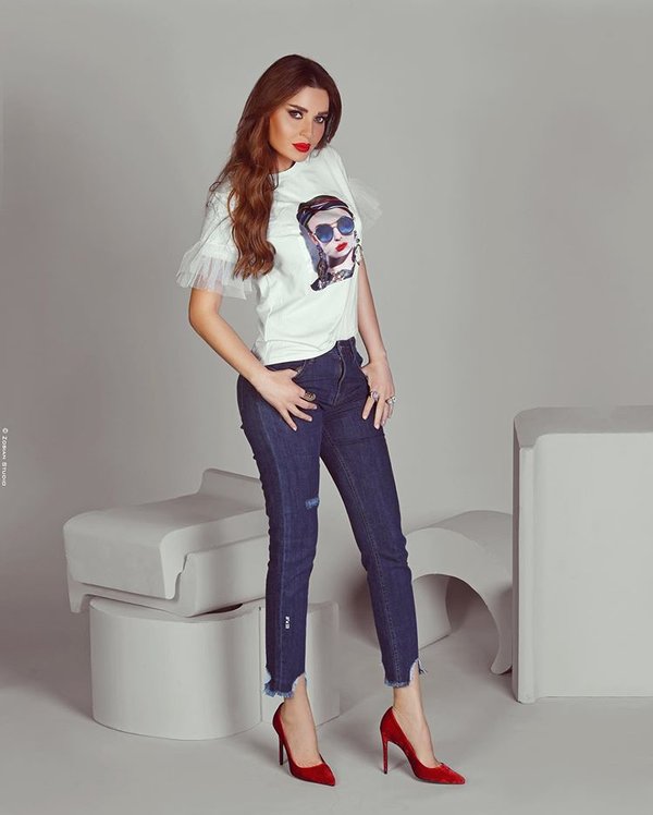 أما إطلالتها الثانية فكانت سروالاً من الدنيم مع قميص أبيض بأكمام واسعة، مع حذاء بالكعب العالي في أسلوب أنيق جداً.