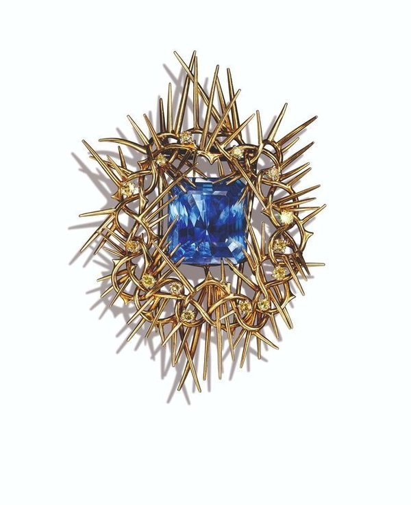 5- مصدر إلهام هذه القطعة الأيقونية دبوس Thorns الشهير للمصمم جان شلمبرجير الذي أبدعه في عام 1947 قبل انضمامه لفريق Tiffany & Co. في عام 1956. ويُعرض دبوس Thorns، بتصميمه المتميز من النتوءات المصنوعة على شكل أشواك من الذهب الأصفر عيار 18 قيراطاً والتي يتوسطها حجر ياقوت بوزن 47 قيراطاً، في معرض العلامة الذي يُقام في لندن تحت اسم الرؤية والبراعة حتى 19 أغسطس.