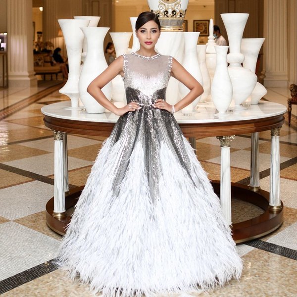 في أحدث إطلالة لها، سحرتنا مهيرة عبد العزيز بفستان فضي اللون تميز بقصته الواسعة من الأسفل مع تنورة من الريش.