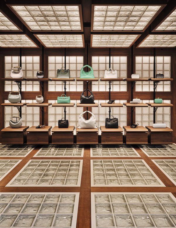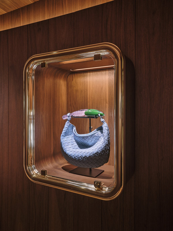 ارتباط Bottega Veneta بالحرفية في الأثاث والتركيبات الفريدة من نوعها، نرصده بشكل واضح من خلال القضبان المعلقة المصنوعة من الخشب والزجاج حسب الطلب، والتي تم صبها يدويًا على يد حرفيين من مدينة البندقية.