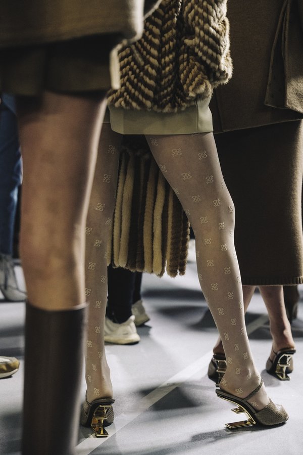 ففي استعادة للكعب الناتئ الذي طُرح للمرّة الأولى في مجموعة ربيع وصيف العام 2000، يتألّق في الموسم الجديد حذاء ذو تصميم هندسيّ يحمل شعارFendi "F"F، ويمزج ما بين البساطة الغرافيكيّة والرفاهيّة الراقية. كذلك، رأينا في هذه المجموعة تصاميم منوّعة من الأقمشة التي تتراوح بين الجلد اللمّاع والصوف المنفوش وصولاً إلى فرو المنك الملوّن بلمسات ورديّة، كلّها مزدانة بكعب من المعدن الذهبي.