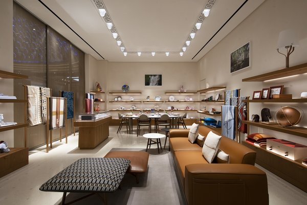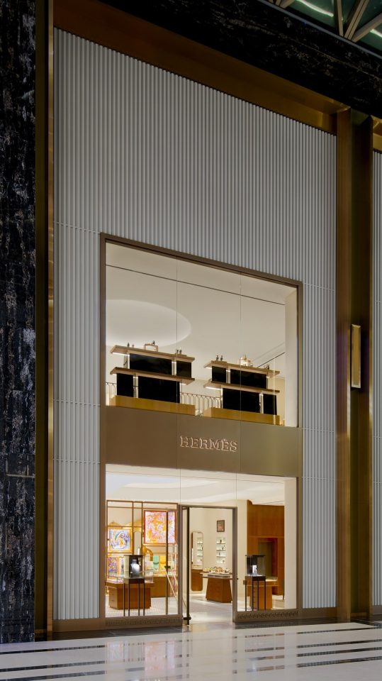 على مساحة 512 متر مربع وعلى مدى طابقين، تقدّم Hermès لزوارها تجربة فريدة من نوعها. عند مدخل الطابق الأرضي يجد الزوار فسيفساء Hermès Faubourg الشهيرة باللونين الأبيض والبني الداكن المزينة بالحصى.