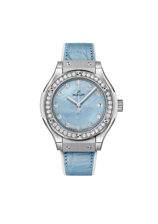 أما ساعة Classic Fusion United Arab Emirates 33mm، فهي تجسّد أسلوبًا رقيقًا وتعكس الزبد المتلألئ المتراقص على الأمواج، من خلال ٤٧ حبة من الألماس الأبيض يقارب وزنها القيراط. أمّا قرصها الخلّاب من عرق اللؤلؤ الأزرق، المرصّع بـ١١ حبة من الألماس الأبيض، فيُعدّ إشادة بالأناقة الكلاسيكية. ورُصّع الإطار بـ٣٦ حبة من الألماس الأبيض بحيث يُضفي لمسات برّاقة لافتة على التصميم.