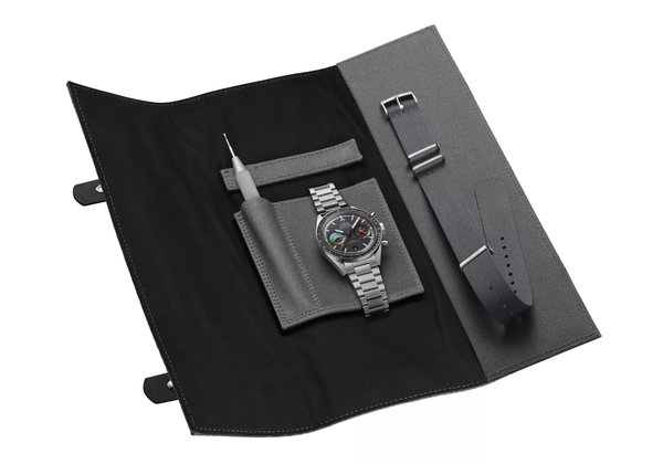 لتوفير الراحة والمتانة، تم تزويد ساعة Speedmaster Pilot من OMEGA بسوار متعدد الوصلات من الفولاذ المقاوم للصدأ وحزام الناتو الإضافي المصنوع من ألياف الكيفلار.
