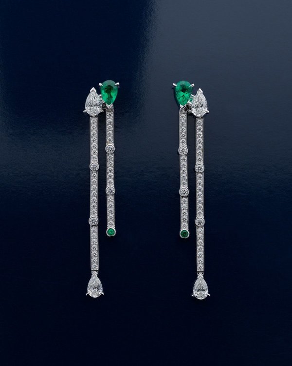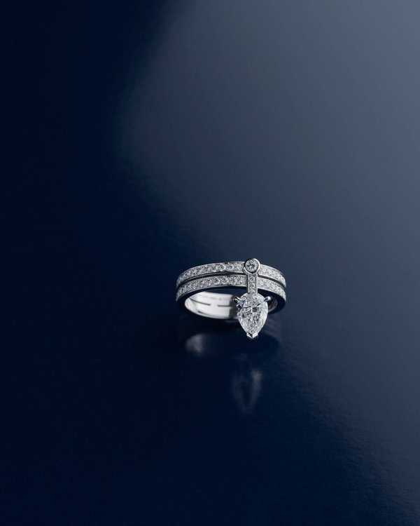 يكمن قلب مجموعة Serti sur vide في أحجار الألماس على شكل كمثرى التي تتحدى الجاذبية، مما يخلق وهمًا بالتألق العائم.