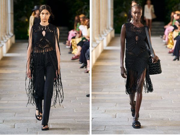 تنوعت تصاميم المجموعة ما بين السراويل الواسعة، الفساتين القصيرة والطويلة، السترات المطرزة. لاحظنا عودة قوية لقماش الكروشيه والشراريب إلى جانب الدانتيل والحرير الذي يعتبر من DNA العلامة.