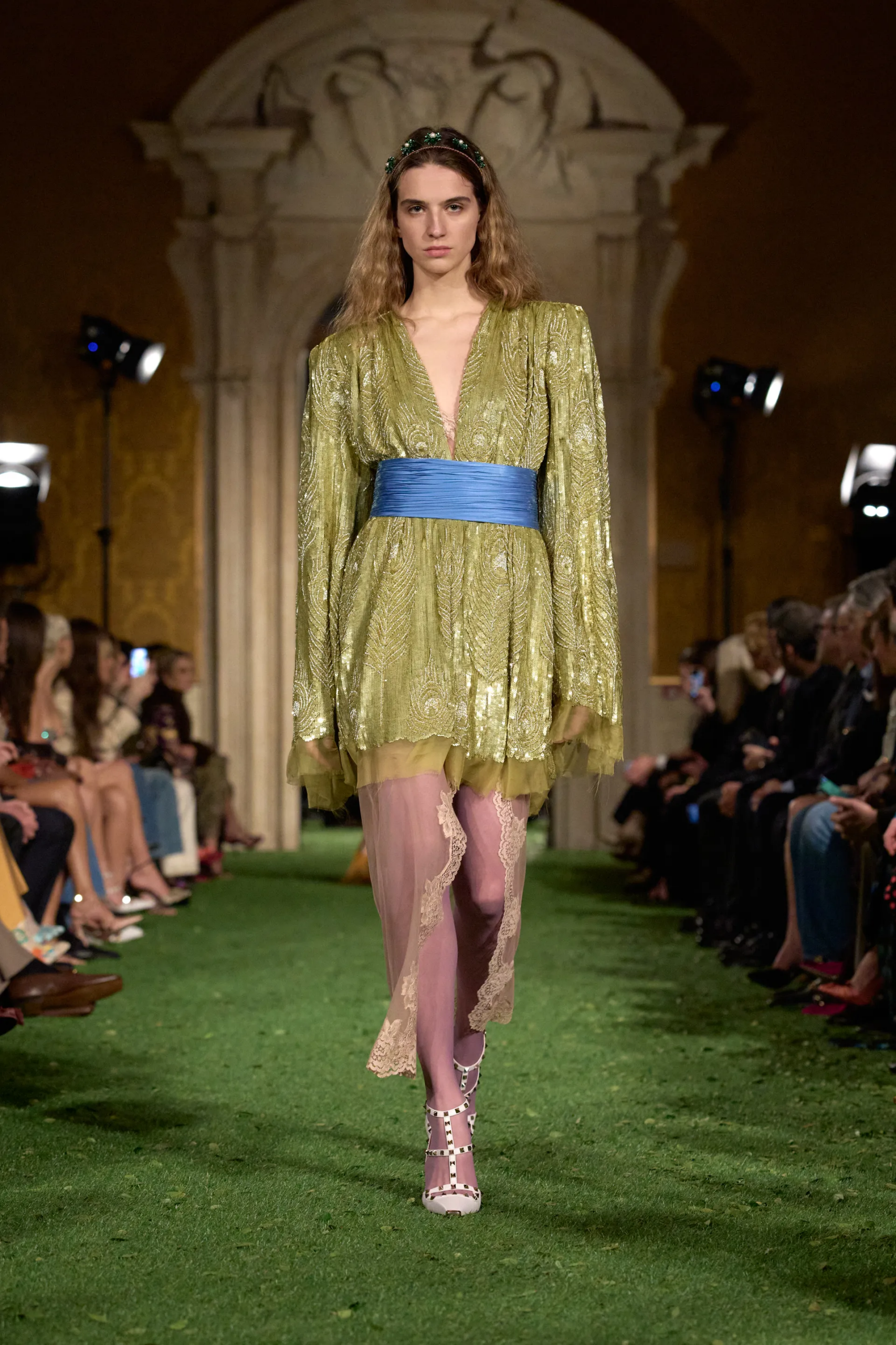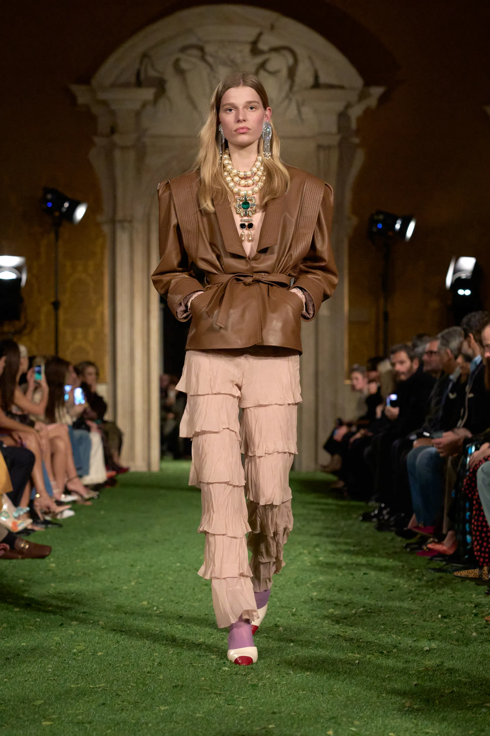 أقيم العرض في قصر Palazzo Barberini الذي اعتبره المدير الإبداعي المسرح المثالي لعرض الأزياء، مؤكدًا على الاحتكاك الجوهري بين الصرامة والتجاوز الذي يسكن العمارة والموضة.