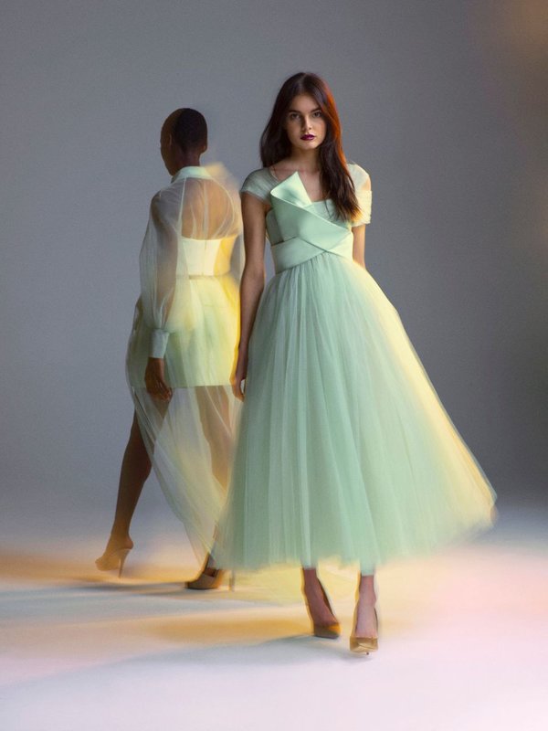 تميزت المجموعة بفساتينها الطويلة ذات القماش الخفيف المنسدل، مزينة بالشرائط الحريرية وبدرجات ألوان وردية.