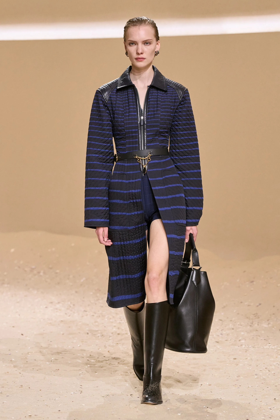 من ناحية Hermès، فحافظت العلامة العريقة على ستايلها وهويتها حيث ومن النظرة الأولى، أخذتنا أقمشة الجلد الى عالمٍ آخر مع التركيز على ألوان البني وتدرجاته وصولًا الى العاجي وبعضًا من الأحمر.