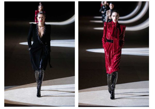 أما فساتين السهرة فقدمها فتنوّعت ما بين المخمل باللون الأسود أو الترتر الأحمر وتم تنسيقها مع الجزمات الجلدية العالية.