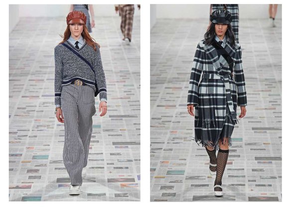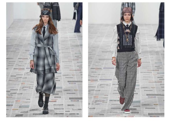 ولنغوص أكثر في التصاميم، فقد استوحتها Chiuri من سنوات مراهقتها وإلى أسلوب السبعينات عدنا معها، حيث عكست الأزياء بكل تفاصيلها قوّة المرأة. فأتت الصيحات مستوحاة من العالم الرجالي والتي رصدناها في تصاميم الجيليه، الكنزات الذكورية، ربطات العنق، نقشات المربعات بتدرجات الرمادي أو الكحلي أو البرغندي أو الأخضر.