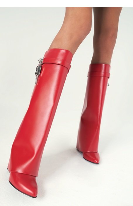 إذا أردت أن تلفتي الأنظار إليك، ما عليك سوى أن تختاري جزمة Shark التي تأتي بأحجام وألوان مختلفة. يمكنك أن تختاريها طويلة الساق بتصميم السروال مصنوعة من جلد العجل ومزينة بمشبك معدني. ما رأيك باللون الأحمر الذي اخترناه لك؟