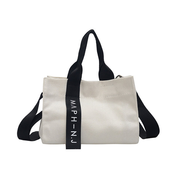 شنط قماش مميزة وغير تقليدية وهي حقيبة باللون الأبيض مع مسكة كتف باللون الأبيض ومسكة يد أخرى باللون البني.