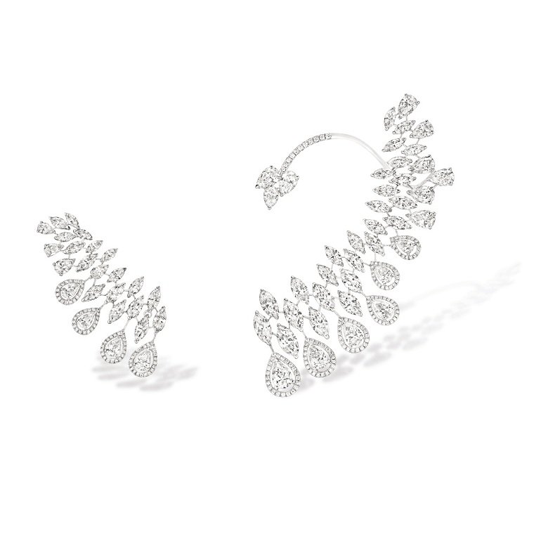 أمّا طقم Kashmir، فهو مؤلّف من أقراط، عقد، سوار وخاتم. وفي تفاصيل العقد، ابتكرت Valérie Messika ثوباً من فصوص الماس البيضاويّة من وحي طيّات الأقمشة الثمينة. ويكسو الماس البشرة بنعومة وأناقة قلّ نظيرهما، وبفضل إضافة ماسة مثلّثة على جانب العقد، يبدو وكأنّه ثمّة بروش يثبّت طيّات القماش. ولا يكتمل العقد الذي يتّسم بدقّة التصميم إلّا بسوار وزوج من الأقراط وخاتم. وتأتي أقراط Kashmir لتحاكي أثر القماش المنسدل. ويبدو كل قرط وكأنّه قماش محبوك من الماس ويشمل خطوطاً من فصوص الماس البيضاويّة التي تنسدل حول الوجه وتتدلّى من الأذنين من ماسة مثلّثة رائعة الجمال. وتشكّل الأقراط الأشبه بثريّا والمصمّمة من فصوص ماس متحرّكة خير دليل على مهارة Messika الفنيّة. كذلك، كرّست Valérie Messika مهارتها المميّزة في ترصيع الأحجار البيضاويّة والمثلّثة لابتكار الخاتم الاستثنائي الذي يلتفّ حول إصبعين، ويشمل ثلاثة صفوف من الأحجار البيضاويّة الموجّهة صوب ماسة كمثريّة الشكل على الإصبع المقابل. إنّه جوهرة نادرة بكل ما للكلمة من معنى.
