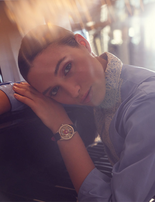 هذه الساعة مصنوعة من الذهب الأبيض ، الأوبال ، السافير ، الزمرد والألماس