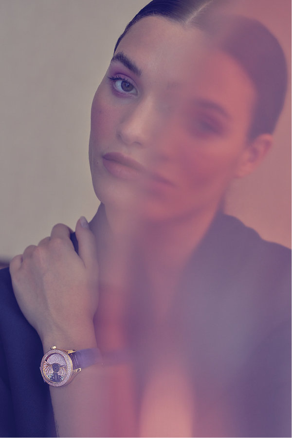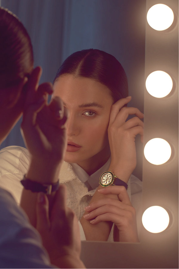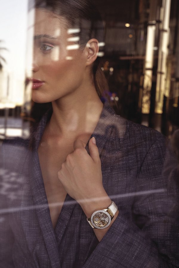 هذه الساعة مصنوعة من الذهب الأصفر ، الذهب الأبيض مع عناصر من الذهب الوردي ، الذهب الأبيض ، جناح الفراشة والألماس و Scarab Beetle Elytra Marquetry.