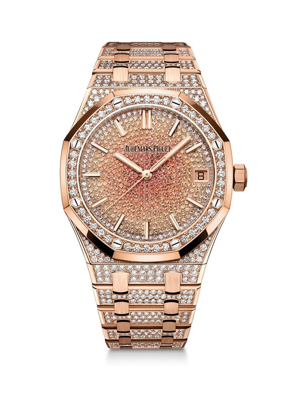 تجمع النسخة المُرصّعة بالأحجار الكريمة من ساعة ROYAL OAK بين الأحجار الثمينة وصناعة الساعات الراقية في تصميم يتميز بطابع الروح الحرّة.