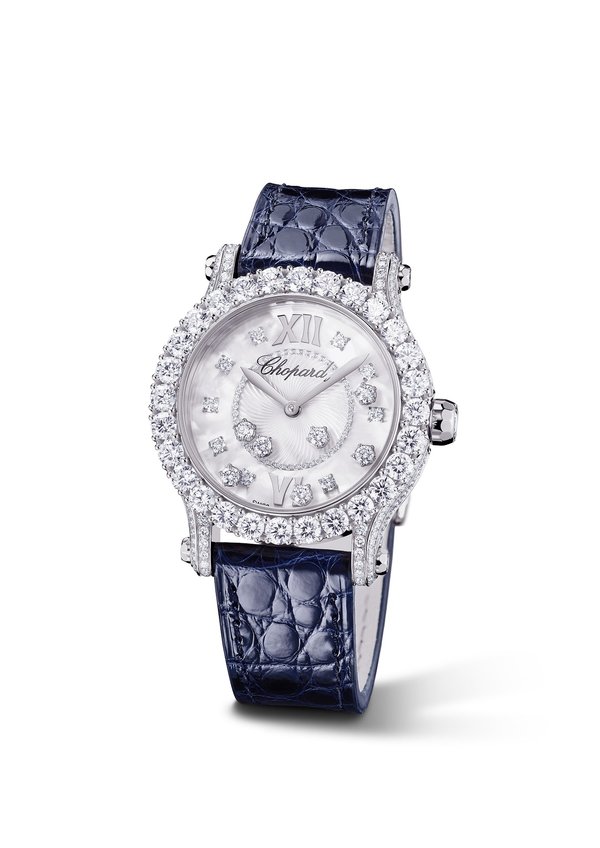 أما ساعات Happy Sport Joaillerie فمصنوعة من الذهب باللون الأبيض أو الوردي. تتميز بحركة أوتوماتيكية، مصنوعة بالكامل ضمن في معامل الدار، مما يضمن تميزاً ميكانيكياً. وقد نجح حرفيو الدار في إضفاء المزيد من البريق على هذه الأحجار الكريمة من خلال الترصيع البارع لإطار زجاج الساعة. مع سوار مصنوع من جلد التمساح.