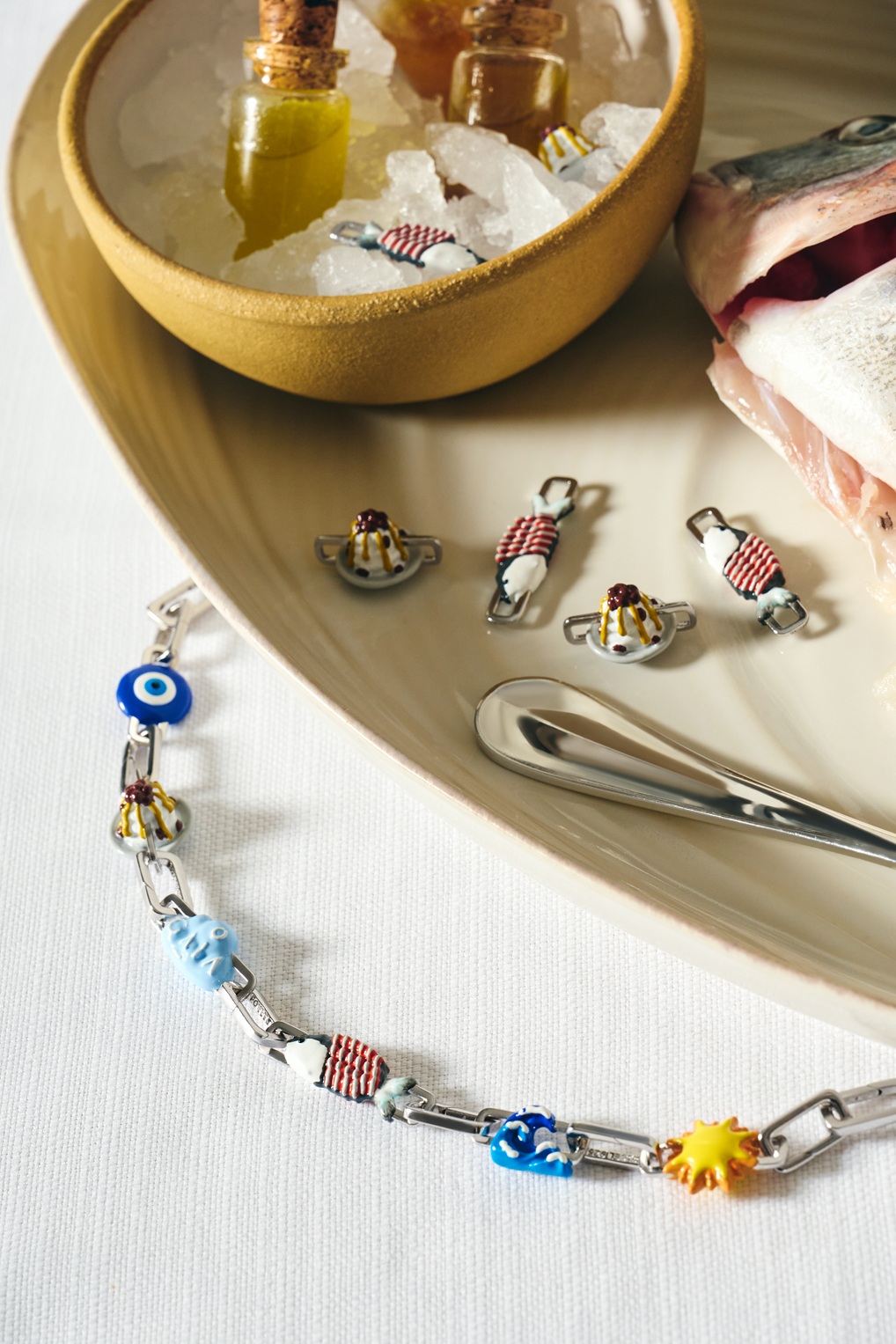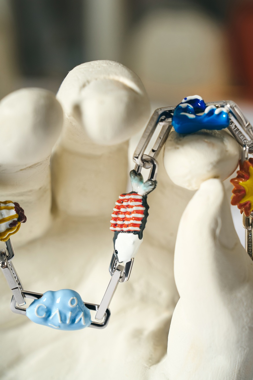 يعتمد التصميم على ستة تعليقات مينا مرسومة يدوياً، تتدلّى على سلسلة فضية بنمط paperclip، مستوحاة من أشهر رموز وأطباق GAIA التي يعرفها زوار المطعم جيداً.