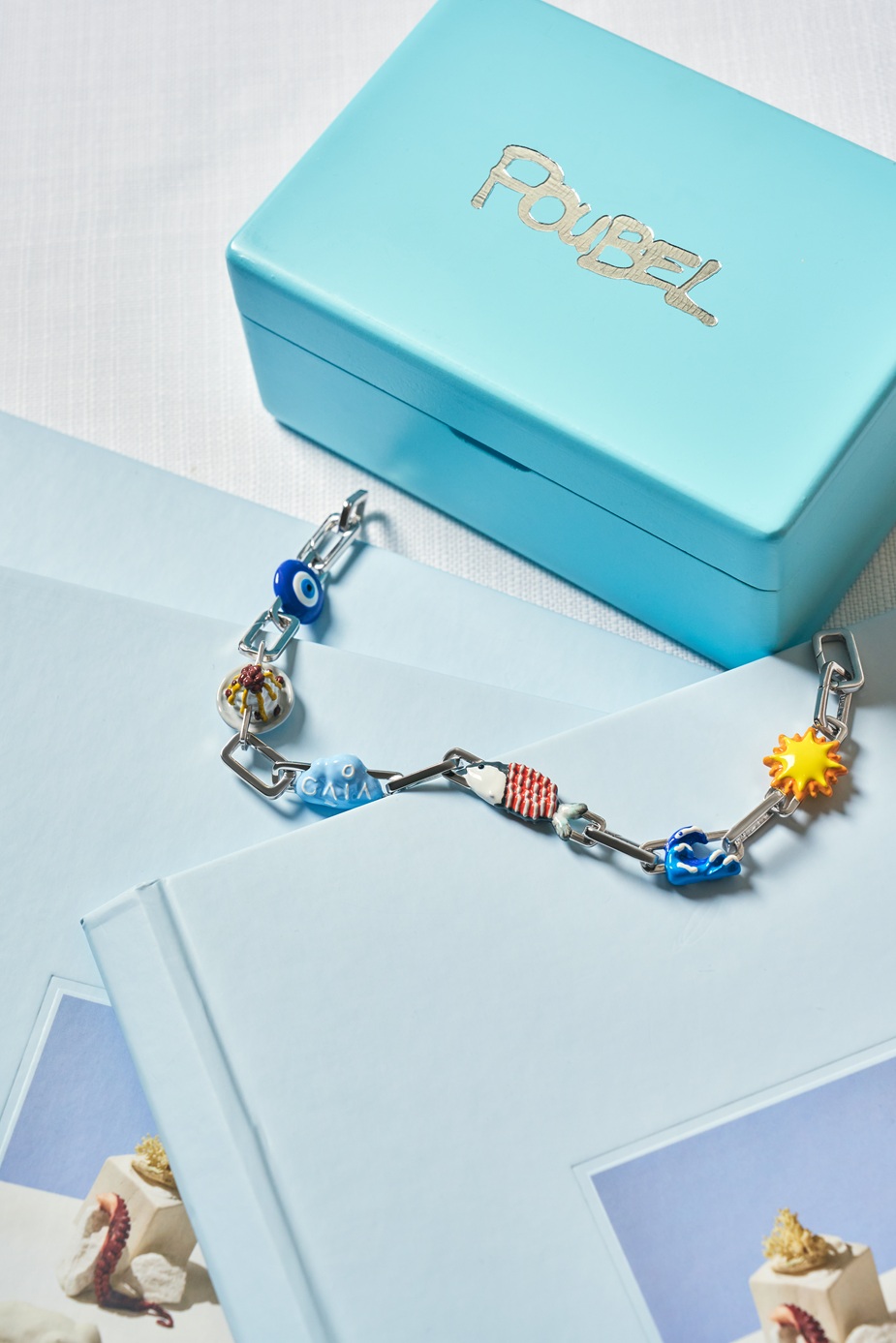 تعكس هذه الرموز عالم GAIA الذي يجمع بين تجربة الطاولة وجذور الثقافة اليونانية الممتدة عبر التاريخ. يأتي الطقم داخل صندوق Poubel الأزرق الفاتح المميز، ليصبح قطعة اقتناء بقدر ما هو مجوهرات.