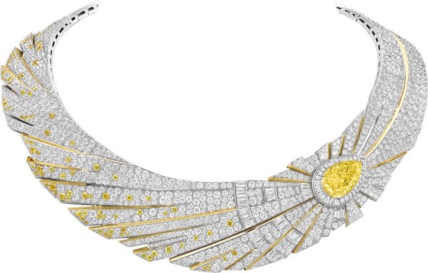 في حين أن عقد هالي من مجموعة Sous Les Etoiles من Van Cleef & Arpels يتميز بتصميمه الحيوي فهو مستوحى من مذنّب هالي. حيث ابدعت الدار في ترجمت هذا الجسم السماوي بتصميم مشرق يبرز بفضل تباين الألماس الأبيض والأصفر. يضيء الإبداع حجر ماس بلون أصفر Fancy Vivid Yellowوبوزن 11.29 قيراط مشيراً إلى رأس المذنّب. يتميّز هذا الحجر بحجم كبير ذات قطع إجاصي ومواد قديمة ذات النقاء المتميز ولون أصفر دافئ، مما يجعله أحد أبرز كنوز هذه المجموعة.