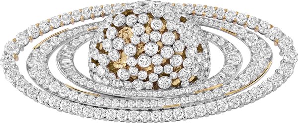 من أجمل إبداعات مجموعة Sous Les Etoiles من Van Cleef & Arpels مشبك ساتورن من الذهب والألماس الذي يعكس براعة وحرفية الدار في صياغة المجوهرات.