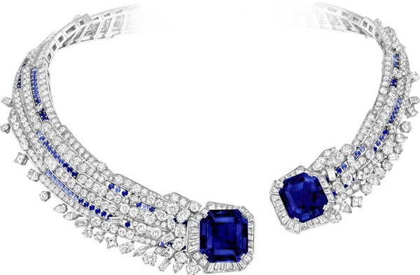 من القطع التي لفتت انتباهنا في مجموعة Sous Les Etoiles من Van Cleef & Arpels عقد تريزور أسترال من السافير والألماس مرصع بمستويات مختلفة، تضفي شعوراً حيوياً وديناميكياً. فهو مستوحى من عقود الطوقية التي أبدعتها الدار عبر التاريخ، يتيح المجال أمام حوار مذهل بين حجرين ثمينين متشابهين ولكن كل بميزاته.