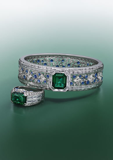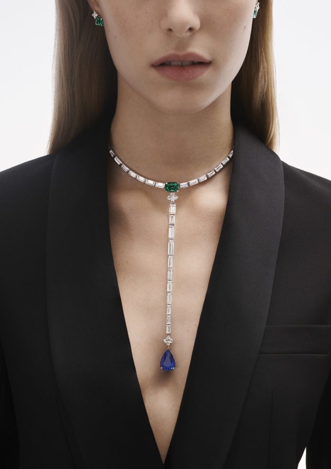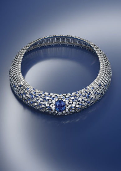 لقد أمضى خبراء مجوهرات في الدار أكثر من 900 ساعة في ابتكار نمط لوحة الدار، الذي يضم أيضاً العقد القصير وهوعبارة عن عمل مترابط دقيق يرتكز على الحركة. يشع العقد في شبه هالة زرقاء اللون، ويلتقط كل حجر مركب في الذهب الأبيض الضوء ويعكسه.