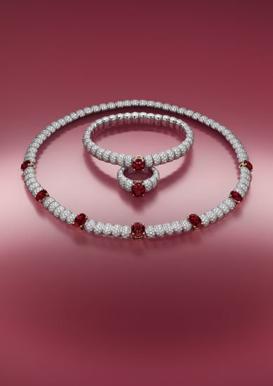 أما في الوسط، فتشع ياقوتة باللون الأزرق الداكن بوزن 15,56 قيراطاً من مدغشقر، فتخطف الأنظار بمكانتها البارزة. وفي الوسط، تشرق حلقة كروية مستوحاة من القمر مع ألماسة 4 قراريط وياقوتة زرقاء 10,09 قيراط. لتحتفي هذه القطع المنحوتة بسحر المرأة المذهل.