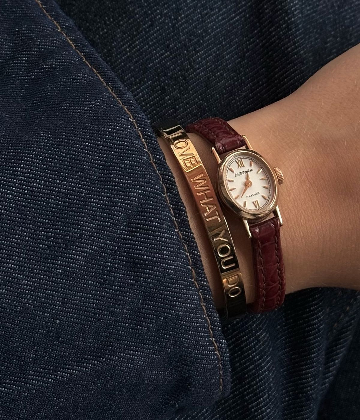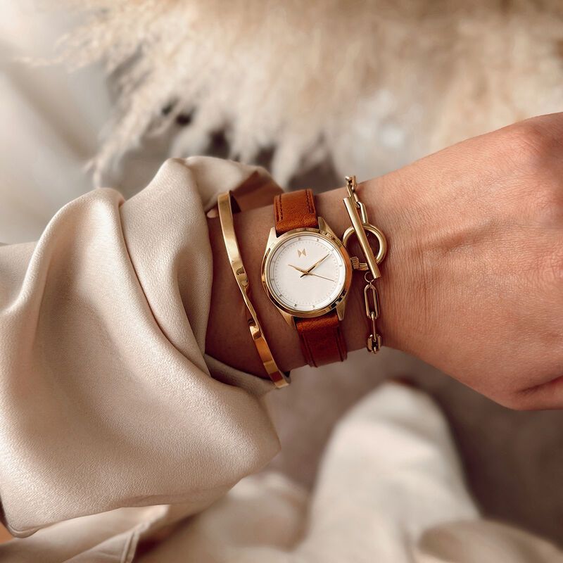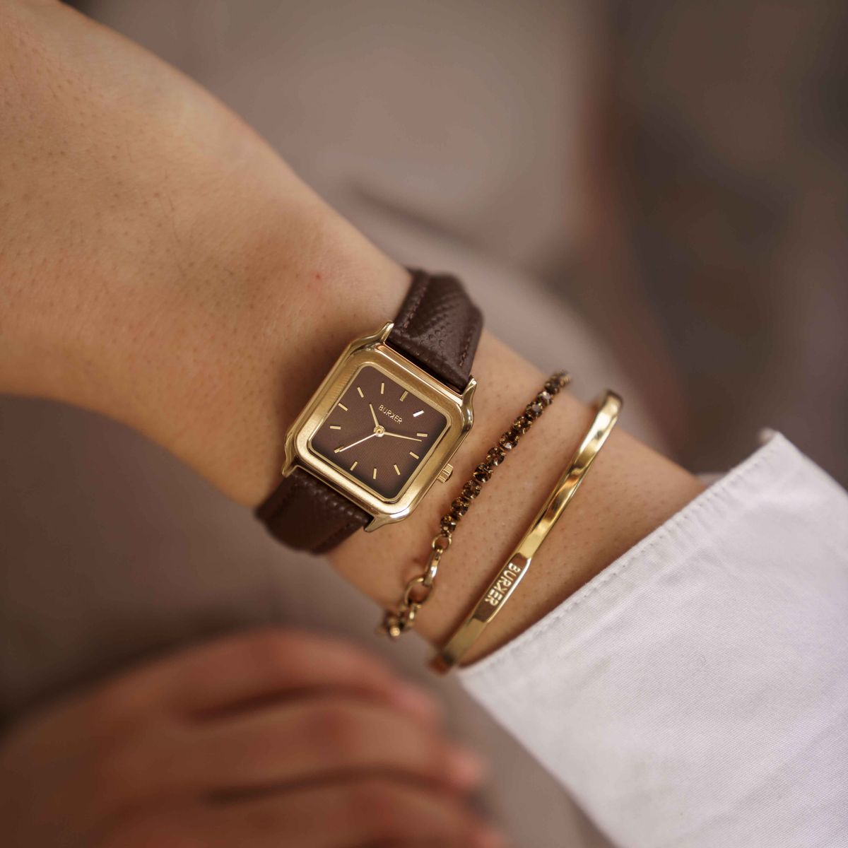 للحصول على إطلالة متناغمة، يمكن تنسيق الساعة مع سوار أو خاتم بلون مماثل، أو حتى مع حقيبة جلدية بالدرجة البنية نفسها. هذا التنسيق يخلق انسجاماً بصرياً ويبرز ذوقكِ الرفيع. وطبعاً يمكنك اعتمادها مع أساور عدّة لأسلوب جريء ولافت.