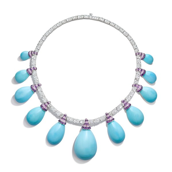 وتعتبر قلادة Maritime Opulance ابتكاراً فريداً من نوعه، فهي مصنوعة من الذهب الأبيض عيار 18 قيراطاً مع 336 حجر ماس أسود و331 حجر ماس أبيض. هذا وتمّ ترصيعها بـ11 حجر فيروز بتقطيع كابوشون منتقاة بعناية بحجم مثالي ولون عميق لا مثيل له.