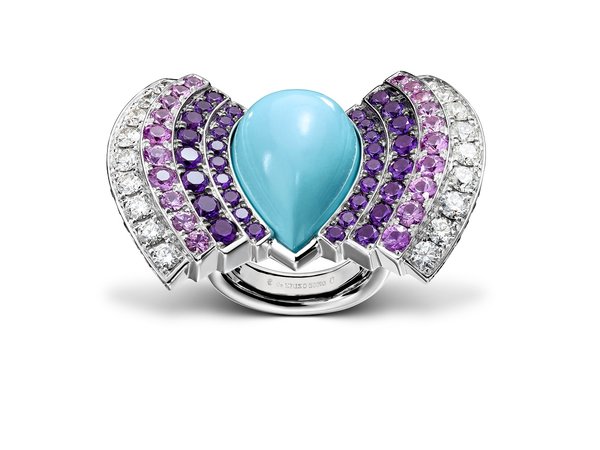 أما خاتم Aquatic Fan المرصّع بحجر فيروز و18 حجر ماس أبيض و49 حجر ياقوت وردي و131 حجر جمشت، فيشكّل طقماً مذهلاً مع القلادة الفيروزية، ويزدان بزخارف مجموعة Ventaglio المميّزة فينضح رقياً وجمالاً.