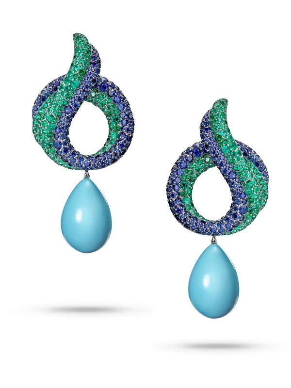 أما أقراط Making Waves، فتستحضر روعة البحر وأمواج المحيط، إذ تتزاوج أحجار الزمرد مع التيتانيوم والذهب الأبيض. كذلك، هي مرصّعة بحجري فيروز و418 حجر زمرد و480 حجر ياقوت أزرق.