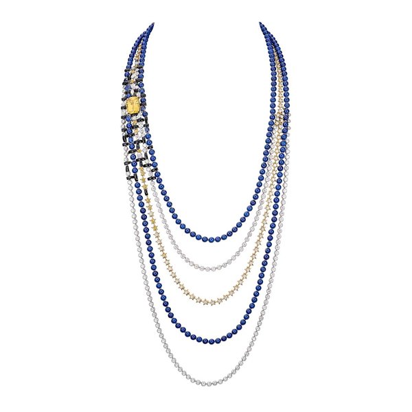 محور مجموعة Tweed De Chanel قلادة Tweed Royal.المصنوعة بمهارة ومزخرفة بسلسلة، بالأماس ومجموعة مميزة من 37 ياقوتة.