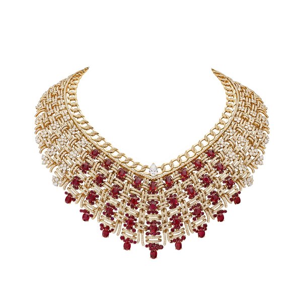 على سطح سادة، تتداخل الماسات واللؤلؤ وأحجار الیاقوت وتتكون طبقات منھا، لتشكل قلائد وخواتم وأساور بتأثیر قماش التوید الخشن الجذاب. وتشیر الخطوط الأنیقة لكل ابتكار إلى النمط البارز لھذه الحیاكة الممیزة المنفذة حصریًا بالید.