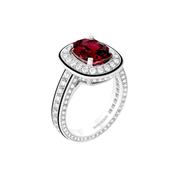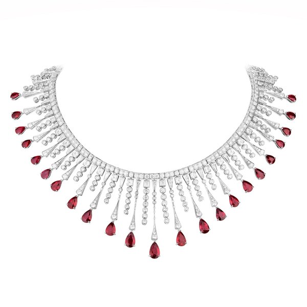 تم تصميم هذا العقد من 23 حجر ياقوت محاطة بهالات من بالماس فوق الذهب الأبيض. شكله مستوحى من أشعة الشمس، حيث تظهر بشكل واضح الحرفية الحقيقية لدار Boucheron.