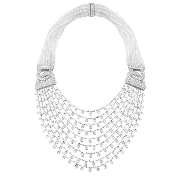يعكس عقد Goutte de Cristal أبرز العناصر الزخرفية التي تحمل توقيع Boucheron، فقد تم نحت الكريستال الصخري ليتلاعب بالضوء، لتنتشر حبّاته فوق 13 خيطاً من الحرير، مستعيدة أسرار إتقان الصنع الذي اشتهرت به الدار. وقد تم ابتكار أقراط متدلّية مرصّعة بالماس المتلألئ وخاتم سوليتير مرصّع بالكامل.
