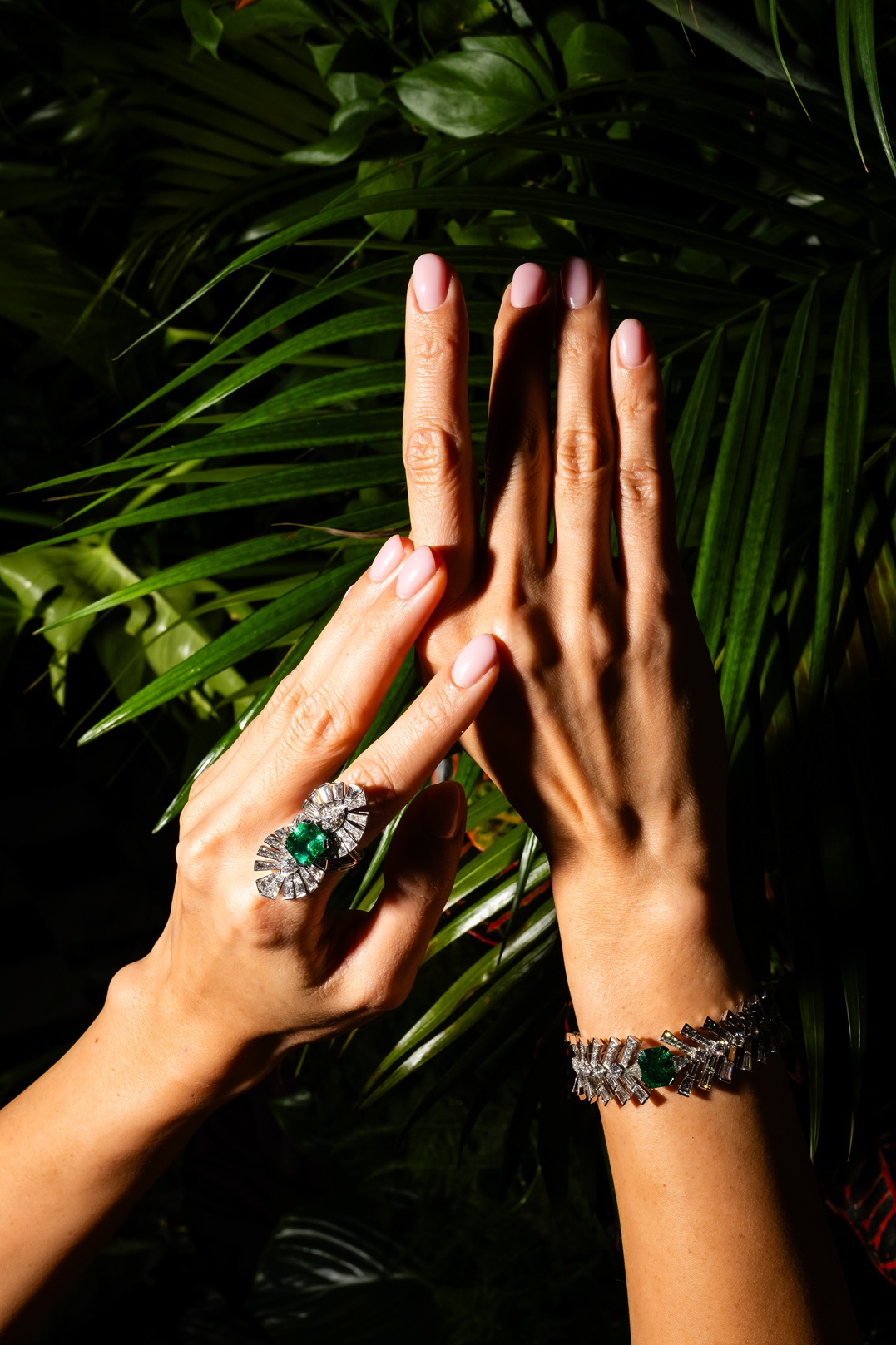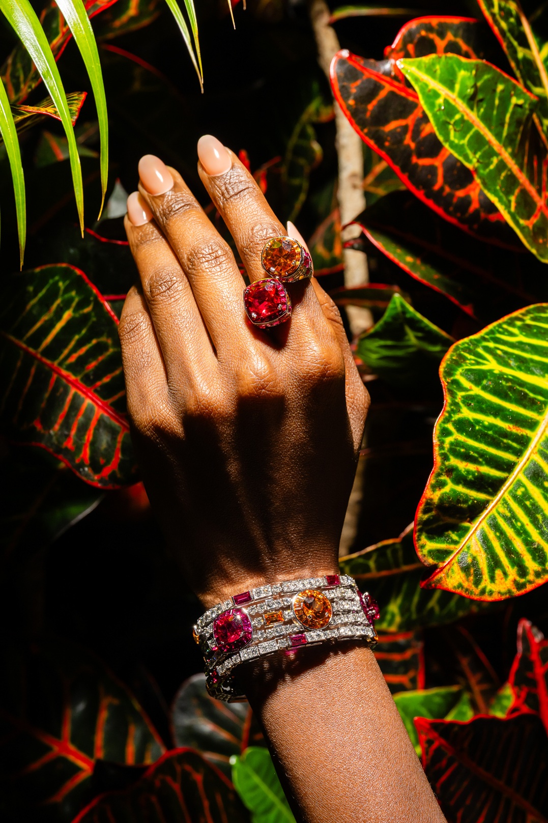 تتلألأ القطع بأحجار الأوبال الأسترالي، الإسبينل، الزمرد الكولومبي، الياقوت السريلانكي وغيرها من الأحجار الكريمة المختارة بعناية، فتتداخل درجات الوردي والأحمر والبرتقالي والأزرق في تناغم بصري آسر.