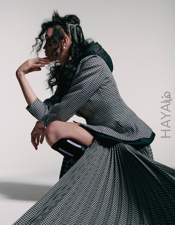 أقراط، خاتم، سترة Houndstooth سوداء وبيضاء بقلنسوة، تنّورة سوداء وبيضاء بطيّات وجوارب سوداء وبيضاء.