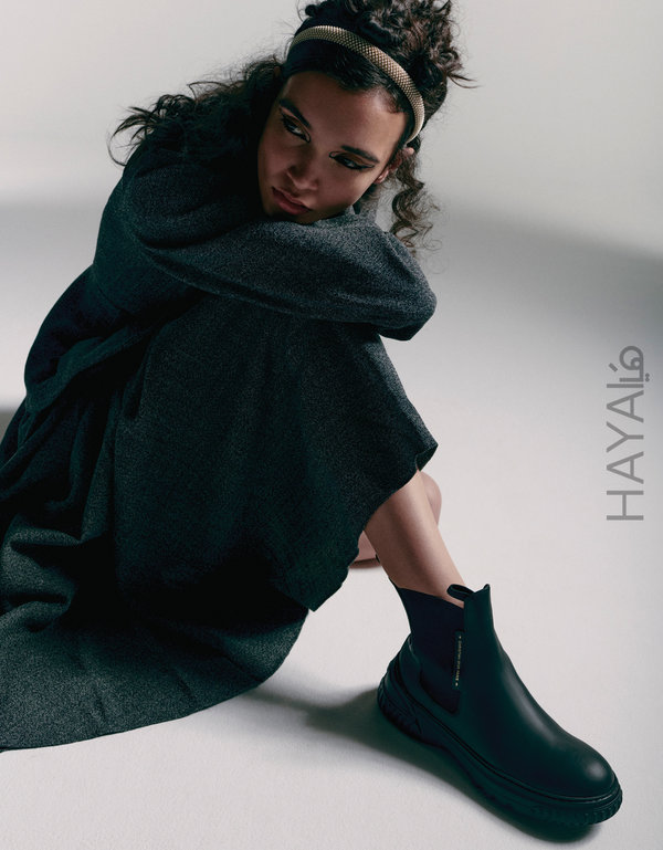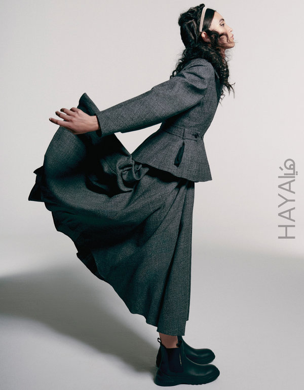 تاج للشعر،سترة رماديّة، تنّورة رماديّة وجزمة D-Racer قصيرة وسوداء.