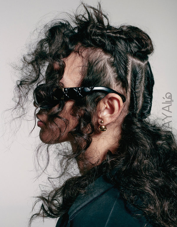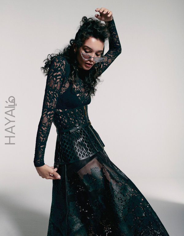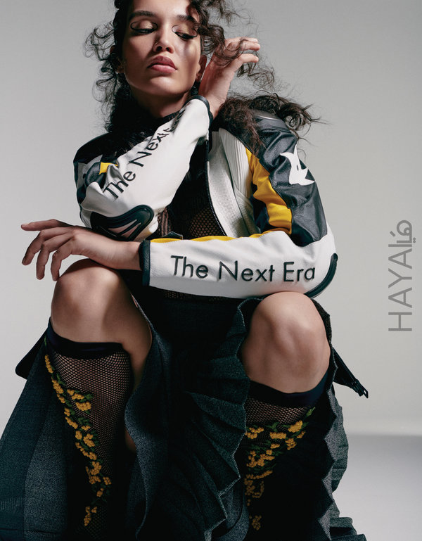 قميص شبكيّة سوداء، سترة جلديّة متعدّدة الألوان وتنّورة رماديّة.