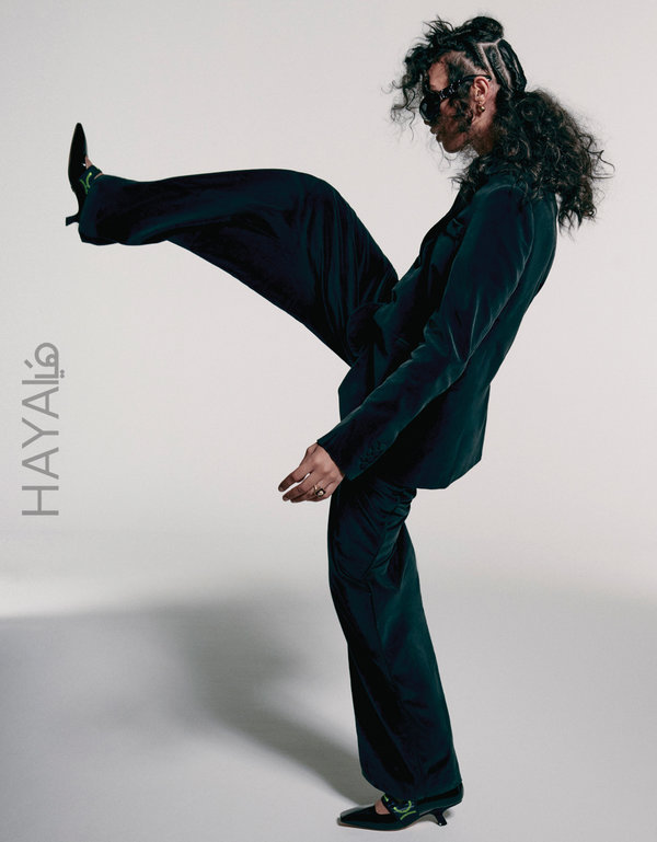 نظّارات Lady 95.22 R1I سوداء، أقراط، خاتم، سترة سوداء من المخمل، سروال أسود من المخمل وحذاء Dior 62-22 أسود بكعب.