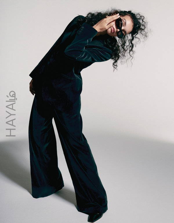 نظّارات Lady 95.22 R1I سوداء، أقراط، خاتم، سترة سوداء من المخمل، سروال أسود من المخمل وحذاء أسود.