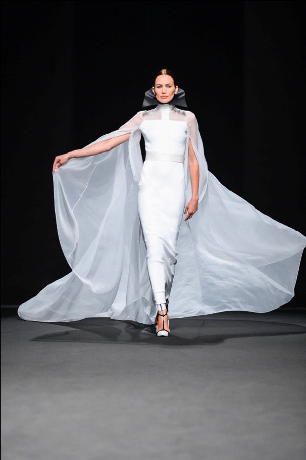 إليك هذه الفساتين التي قدّمها لك المصمّم Stephane Rolland في إطار مجموعته لشتاء 14-2013. من أبرز مميّزات هذه التصاميم القبّة ذات الشكل الغرافيكي الملحوظ والمزوّدة بالثنيات إضافة إلى الصدار الأنيق، فهما مصنوعان من حرير الـ «فاي» الأبيض المصقول الذي يتمتّع تقليدياً بلمسة برّاقة ويضفيان أثراً نحتياً على الصدر. وحدات قماشية من الحرير الأسود تبرز على مستوى الجذع ورسوم متغيّرة الألوان تنهمر كالرذاذ على تنورة من الأزرق السماوي ونيران مادة الـ«رودويد» السوداء تندلع من أنسجة الحرير الهشّ ذات الشكل الحلزوني وتدرجات الفينيل النيلية تعانق شكل المرأة، فالقصّات المحكمة تنطوي على الصرامة والدقّة، وترتقي بالأنوثة الى درجة من الإبداع لا مثيل لها مثيل. الأكسسوارات الوحيدة والأساسية لهذه المجموعة هي الأحزمة المصنوعة من مرايا الزجاج البصري التي تعكس الومضات الضوئية المنبثقة من التصاميم السوداء.