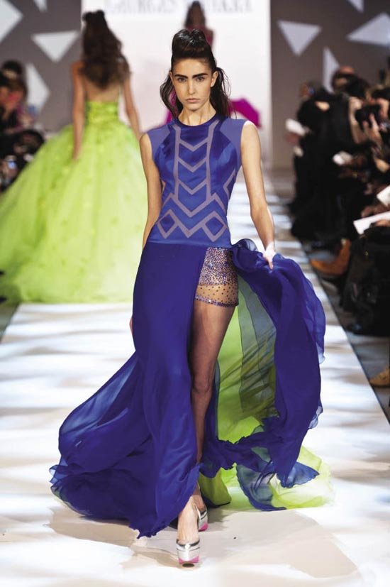 كذلك سيطر اللون الأزرق المتوهّج بكل تدرّجاته على فساتين السهرة، فتبخترت عارضات الأزياء على المنصات متباهيات بما ابتكره مصمّمو الأزياء العالميون.