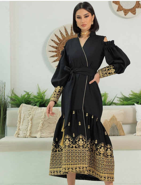 أيضاً لا يغيب اللون الأسود عن تصاميم جلابيات رمضان 2022، وله مكانته بين الألوان حتى في هذا الشهر الفضيل. ولرمضان 2022 اختاري جلابية بتصميم مميز وباللون الأسود مع تطريزات فخمة.