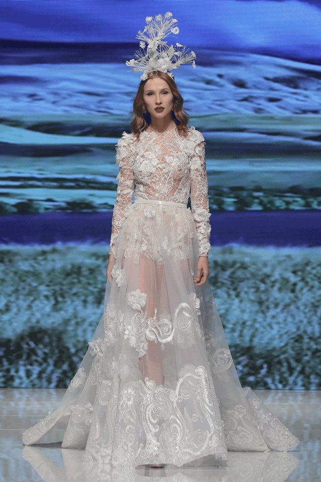 قسم “دار حنا توما للأزياء” قطع المجموعة بطريقة تجمع بين الجرأة والانطباع الرقيق الفائض بالأنوثة، وذلك من خلال أنواع الأقمشة المستخدمة. فإلى جانب أقمشة الـموسلين والأورغونزا اللذين يراعيان الموسم بانسيابية، ويقدمان السيدة بصورة أنثوية راقية، استخدم في المجموعة قماش الـ Resilleوهو عبارة عن “شبك” بأشكال متعددة، يعكس جرأة في التصميم.