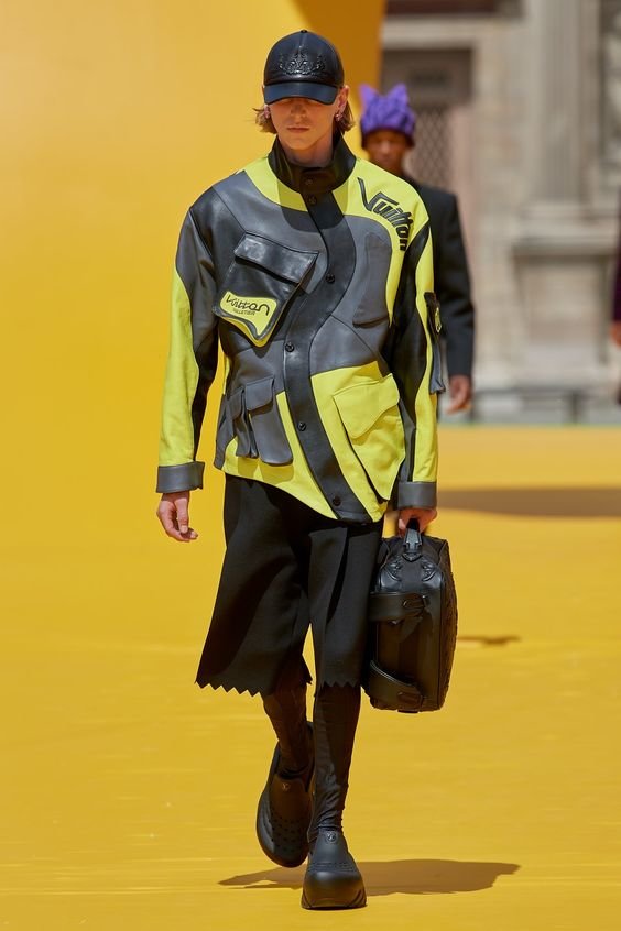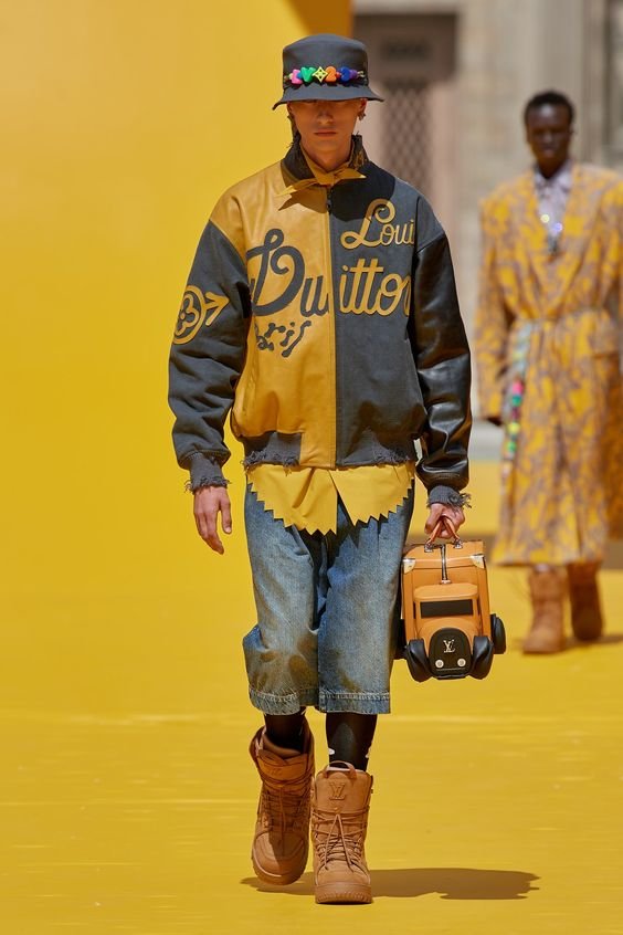 شنطة يد رجالية بتصميم غريب وجريء وغير مألوف من لوي فيتون على شكل شاحنة مصنوعة من الجلد الأصفر .